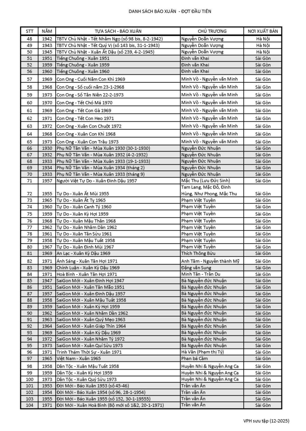 Xin giới thiệu trang Báo Xuân của Kho Chứa Sách Xưa với đợt đầu tiên đă làm xong vào cuối năm 2025 sau sự lựa chọn và sắp xếp (104) số báo Xuân từ (40) bộ nhật báo, tuần báo và đặc san đă phổ biến trong kho, theo danh sách đợt đầu tiên dưới đây.
